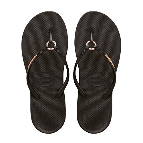 The fantastic Havaianas Womens Ring Flip Flops Black are absolutely ideal for slipping on and wearing on a sunny day at home, or on holiday around the pool! The black rubber upper featuring a rose gold coloured ring embellishment looks brilliant and the soft rubber between your toes will keep you comfortable. The soft and flexible rubber base not only feels good on your feet but also enhances grip making them ideal to wear to and from the beach!