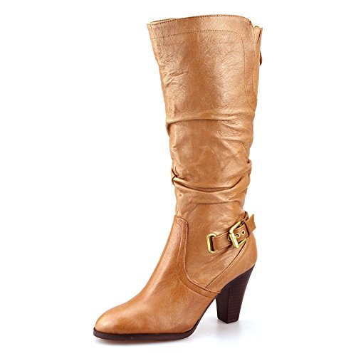 Best Seller! Ladies Womens Leather Knee High Block Heel Zip Up Biker Riding Boots Shoes Size[UK 6,Tan] Review
